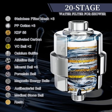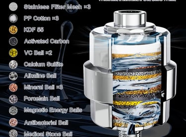 Filtre de douche en 20 étapes comprenant du KDF 55, du sulfite de calcium, des billes alcalines, des billes antibactériennes et des billes minérales.